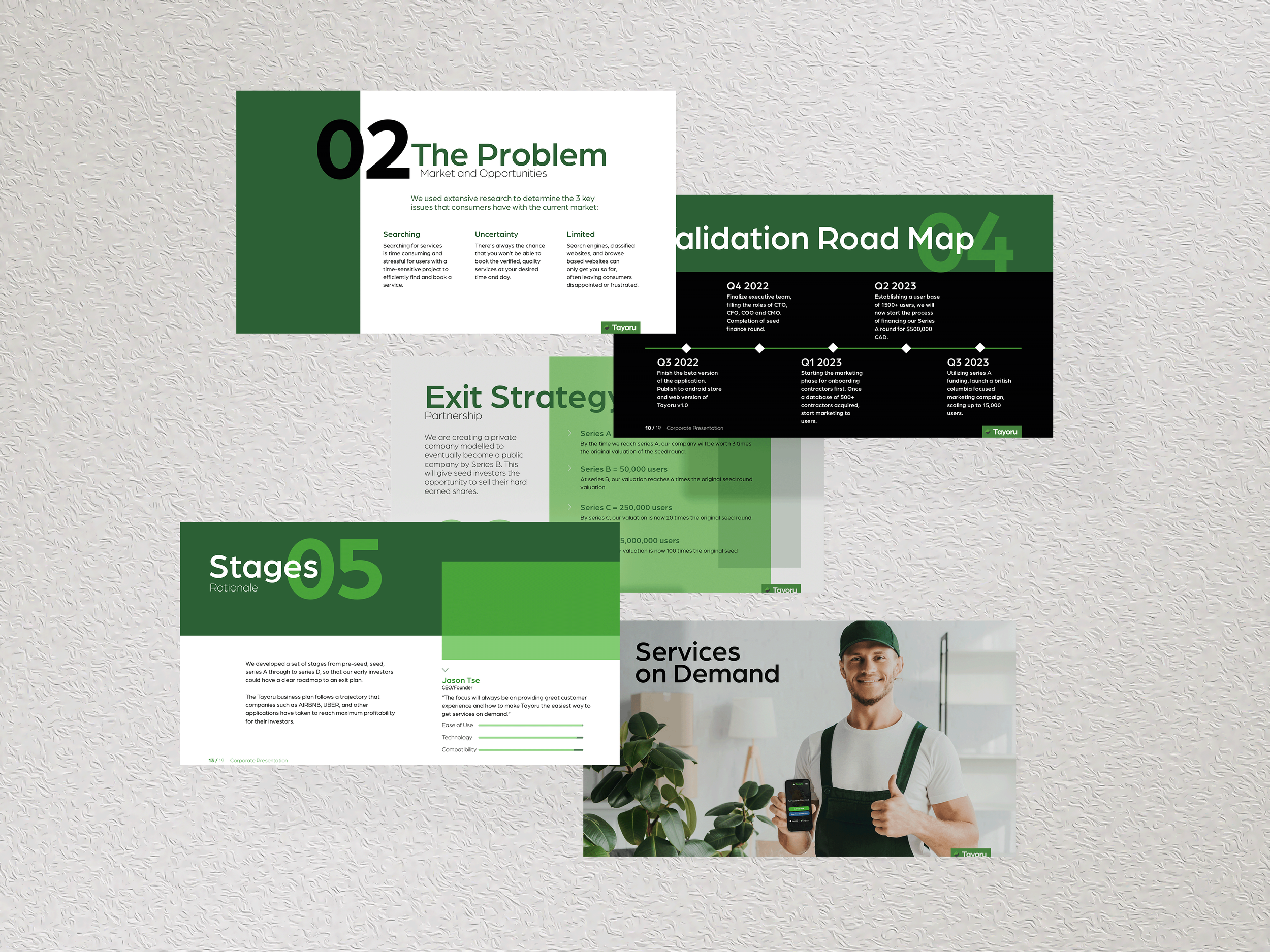 Tayoru is an app developed in 2022 designed to be the most efficient and reliable way to access on-demand services. Users can join as either a Customer or a Provider and communicate within their community for quick and effective assistance. I was assigned to create a Pitch Deck to present important information to potential investors while keeping it cohesive, educational, and visually appealing.