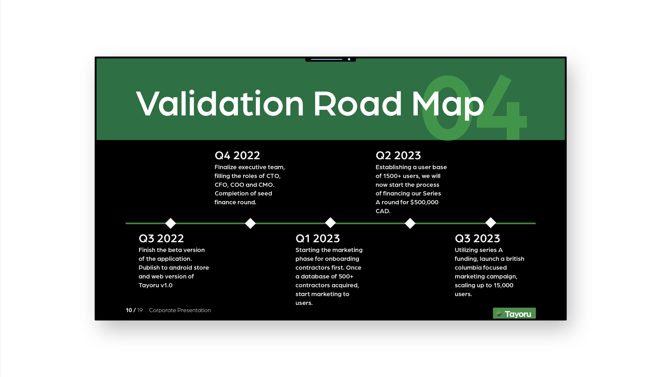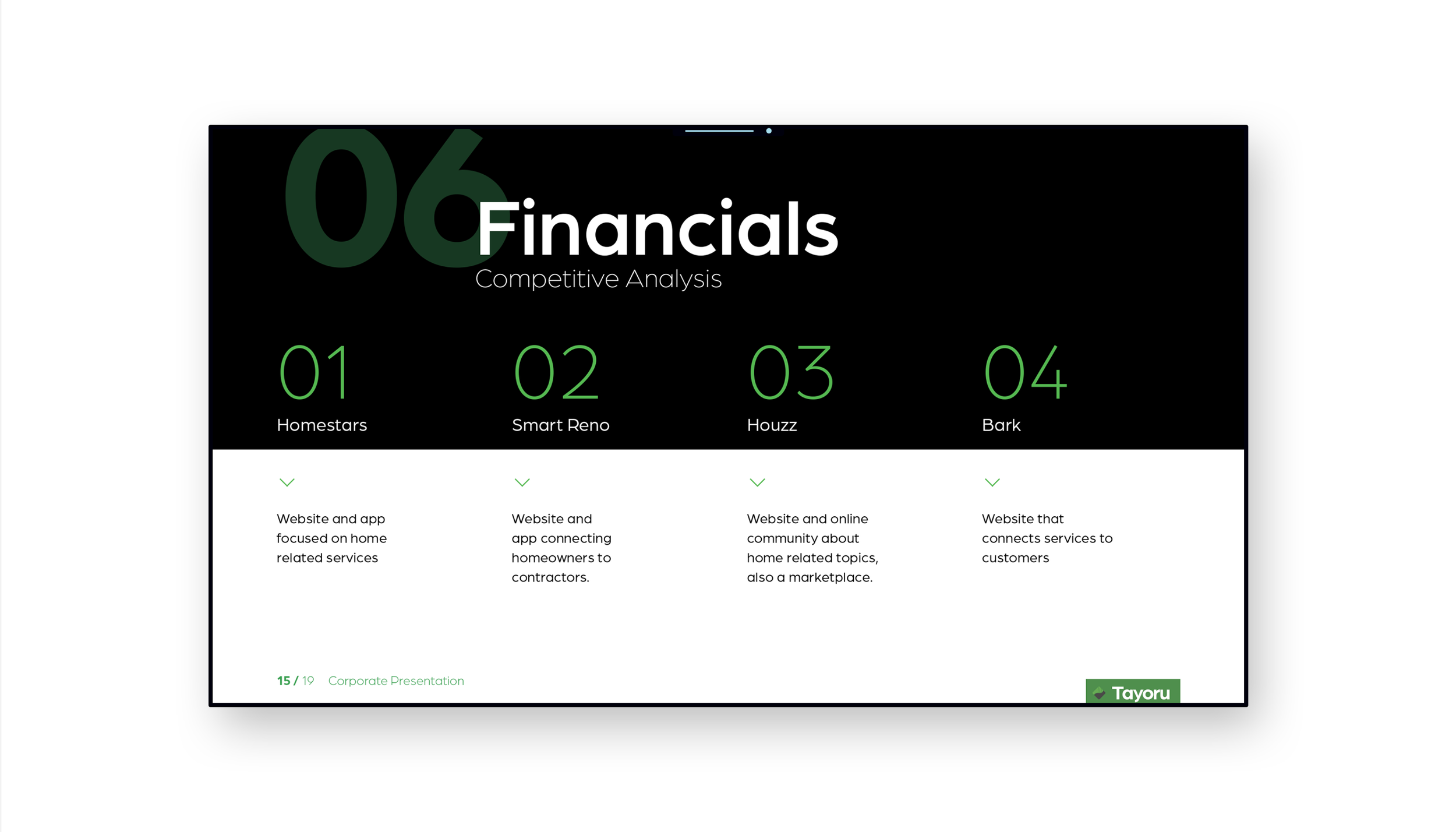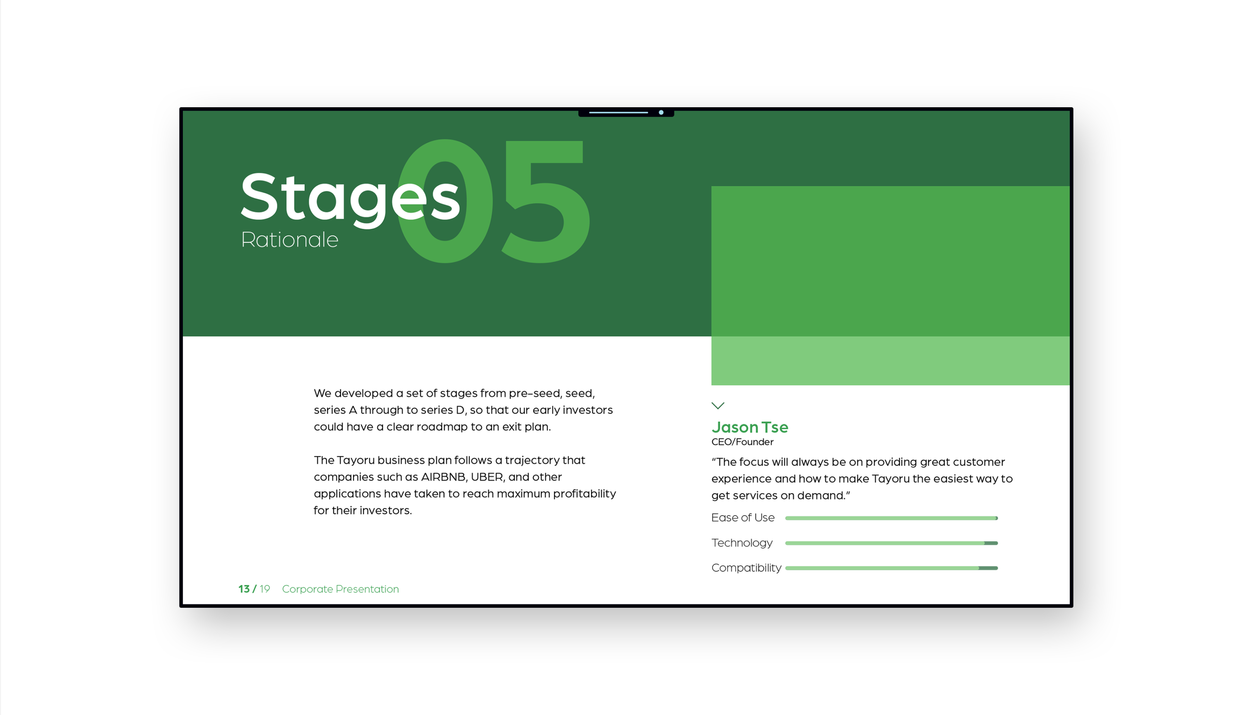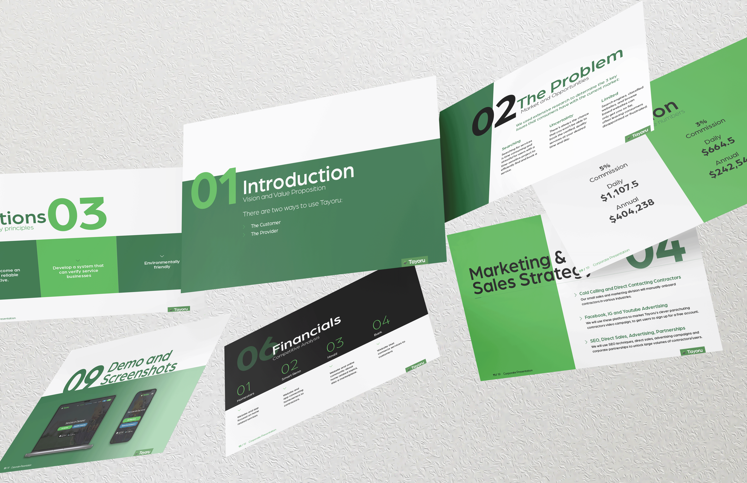I dove into Tayoru’s branding and extracted their logo, colour palette, and typography choices. I then researched other pitch decks for inspiration and functionality while creating layout templates for each page.